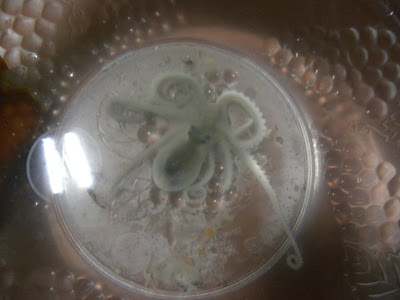 6) Apply sauces as desired and shove him into your mouth. Be sure to chew thoroughly while you are feeling him wriggle around as you do not want any of the suction cups to get stuck to your throat on the way down.