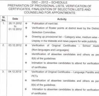 AP DSC 2012 Counselling Schedule. AP DSC2012 Counselling Schedule released. DSC2012 Merit Lists sent to the all districts DEOs on 26.11.2013. Provisional Selected List will be published on December 1st, Certificates verification will be done from December 3rd to 5th December for selected candidates subject wise, category wise. Final Selected Merit List will be published on December 15th. Counselling for selected candidates takes place on December 16th and 17th in all districts at a time. There are totally 21,343 Teacher Posts notified in DSC2012. About 4,23,472 candidates have applied for these Posts. 3,80,091 have attended to this year AP DSC 2012 Examinations which were held on Aug 26, 27 and 28th. AP DSC 2012 Counselling Schedule 1.Merit Lists 26.11.2012 2.Provisionally Selected Candidates List 01.12.2012 3.Certificate Verification 03.12.2012 to 05.12.2012 4.Selected List 15.12.2012 5.Counselling 16.12.2012 to 17.12.2012 |