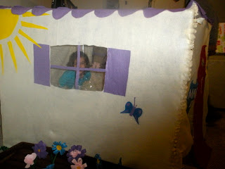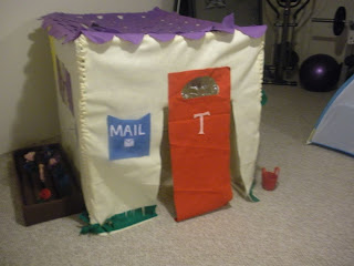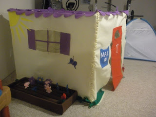 seen these before and you will know just how pathetic my attempt at it is. I lost steam at 11 pm on Christmas Eve, but Talya loves her playhouse. If you google felt playhouse or card table play house, you'll find some really talented people out there make some really great things. The idea is to make a sort of slip cover for a card table that will turn it into a house.
