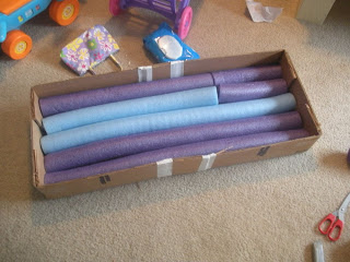 - Cut the pool noodles so you can jam them tightly into a box. Cover them in brown felt.