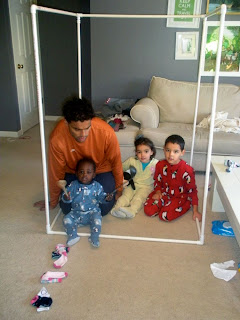 However, we don't have a card table, and Taly's a tall girl and I didn't think she'd have a lot of fun in a 3-foot high box. Instead, I (yes I, not Ben, miracle I didn't cut a finger off) sawed some PVC pipe to size and built my own house frame. There was no way to hide it for a month, so the kids played with PVC pipe for weeks, having no idea what the final product would be.