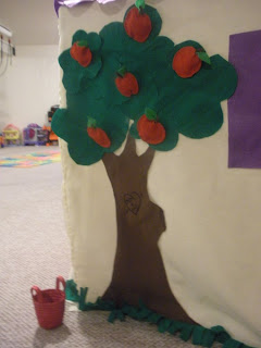 this no-sew method to make the slip cover. It's kind of like making those tie blankets that seemed so clever several years ago. Then I started gluing. And gluing. I think I used a bajillion glue sticks. I made an apple tree with removable apples, windows, a door, a mailbox....