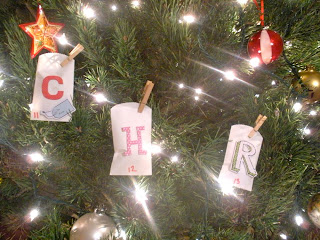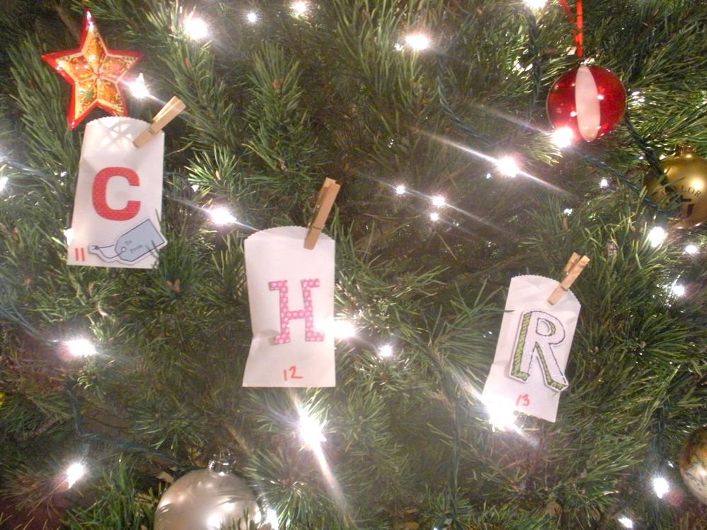 Jesse symbol and little candies. We hung them from a picture hanging wire. This year, the wire had fallen victim to redecorating, and as I debated where to hang our Jesse Symbols it finally dawned on me that (duh) our Christmas Tree can be our Jesse Tree.