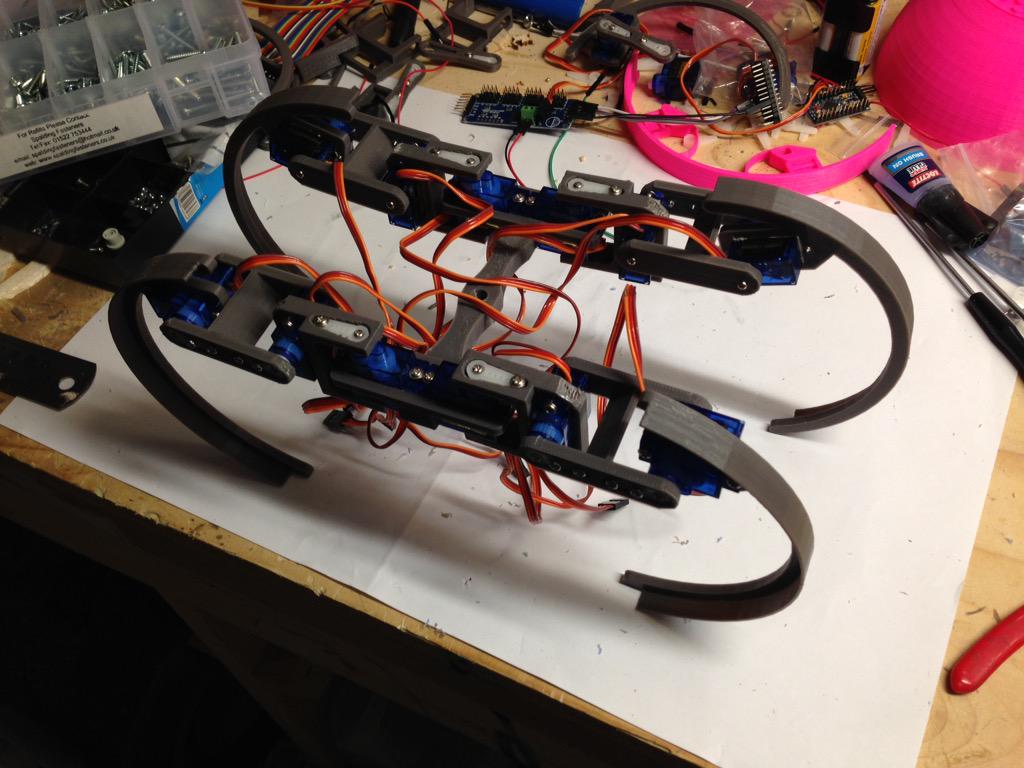 Will probably post a discussion of sensor arrangements at some point, but for now the focus is on building a working prototype. Mk1 (demoed last wed at the hackspace) had full motion, but several of the leg joints weren't stiff enough. mk2 is printed and partially wired: