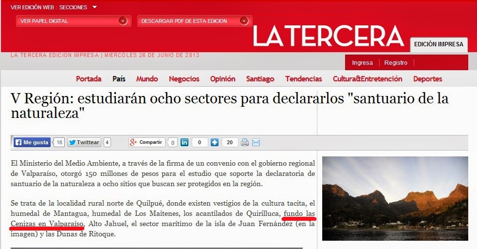 Tal como promociona el diario "La Tercera" (en el titular que encabeza esta entrada) el gobierno regional ya destinó los fondos para el estudio de linea de base, recursos con los cuales el Ministerio de Medio Ambiente ya licitó los estudios, y para el caso del Fundo Las Cenizas, fueron adjudicados por el Instituto de Geografía de la Pontificia Universidad Católica de Valparaíso (PUCV) Universidad con la que hemos realizado varias actividades, siendo la Casa de Estudios Superiores de la cual se nutre en mayor número nuestra rama universitaria del Grupo Tacitas.