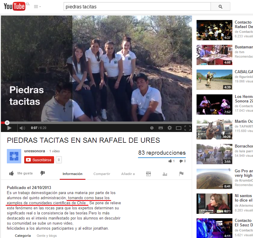 Piedras Tacitas en Ures, Sonora, México Posted: 12 May 2014 10:10 PM PDT Compartimos este video de alumnos de la Preparatoria de Ures, Sonora, México, que abordan el tema de las piedras tacitas y que aluden a nuestro grupo de voluntarios por el patrimonio. Anteriormente ya habíamos destacado el esfuerzo de este grupo de alumnos mexicanos que guiados por su profesor ya habían desarrollado un trabajo similar, pero que han perfeccionado en este video (ver entrada anterior) Sin duda, parte importante de la promoción que tenemos en México es por parte de nuestros Amigos de Caborca y Atlixco, que regularmente nos envían sus aportes, como el que está a pie de página, de nuestro amigo y colaborador Israel Nava Benitez. Hacemos notar que la denominación original en México para estos vestigios es XICALLI o "POCITOS", agradecemos la deferencia en llamarlos "tacitas" como en Chile. |