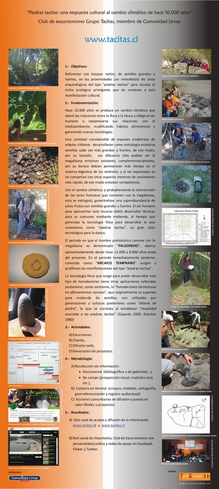 Además de servir de apoyo y complemento a campañas de defensa y valorización del bosque nativo chileno, hemos desarrollado una linea de trabajo, aún incipiente, tendiente a reintroducir especies de bosque nativo en lugares próximos a sitios arqueológicos con "piedras tacitas", como una forma de recrear el nicho ecológico primigenio que no solo les da contexto, sino que justifica su existencia.