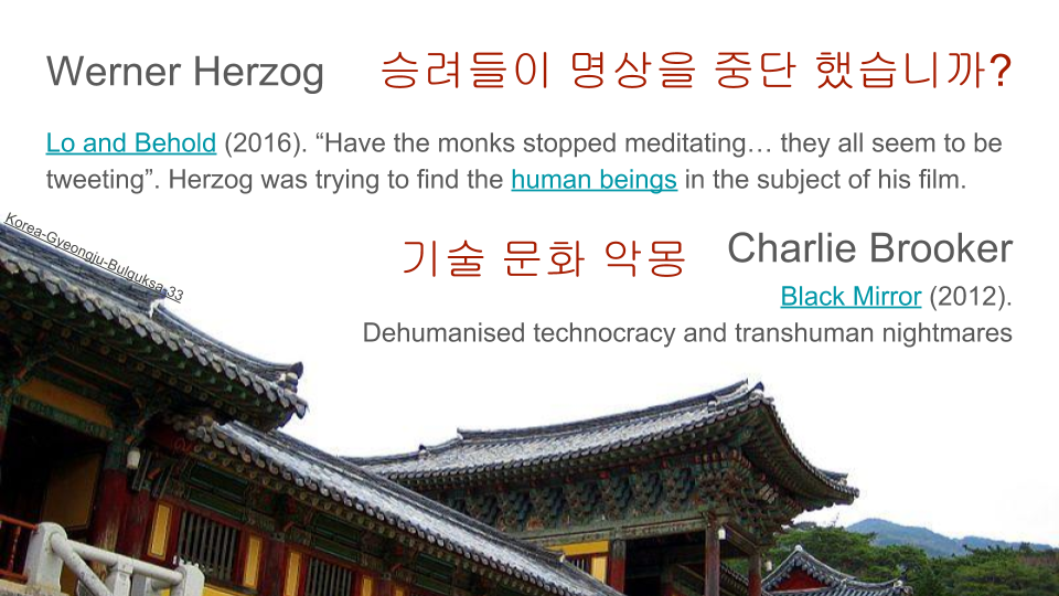 And we can’t reference film without mentioning the greatest film maker of all, Werner Herzog, who recently took on the Internet and its accompanying transhumanism in his feature documentary, Lo and Behold (2016). “Have the monks stopped meditating… they all seem to be tweeting”. In an interview about his film, Herzog said that he was trying to find the human beings in the subject of his film.