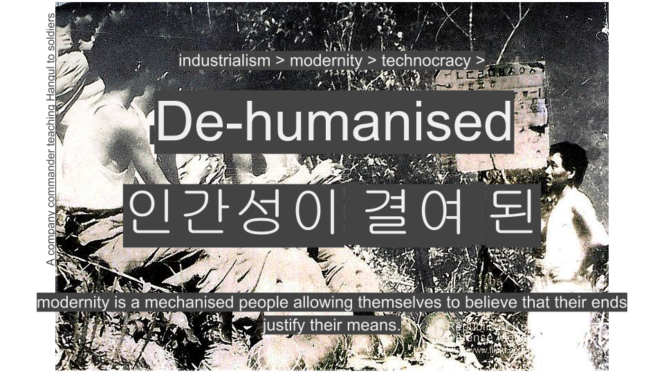 ...Industrialism generated mechanised thinking that became the general ideological foundation of Modernism. This had increasingly dehumanising consequences as it lead to extreme technocracy (fascism). Fascism was not defeated (if it can be said we were even truly fighting it), and technocracy became the world standard for bureaucracy and reason (fascism lite). We became dehumanised by its sheer dominance through Globalism.