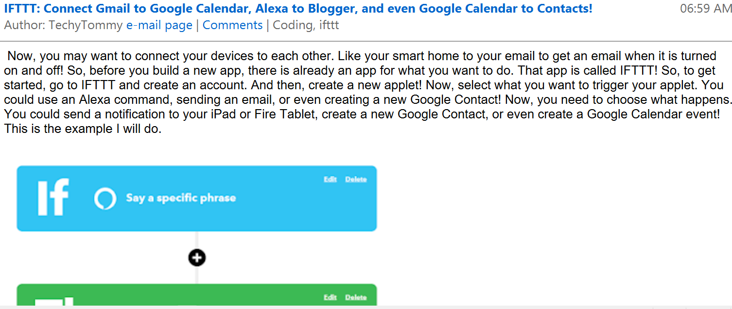 ef="http://feeds.feedburner.com/techytommy" /><feedburner:info uri="techytommy" /><atom10:link xmlns:atom10="https://ift.tt/r5ut6F" rel="hub" href="http://pubsubhubbub.appspot.com/" /><entry><id>tag:blogger.com,1999:blog-7878542713109000453.post-7479948654457705158</id><published>2021-07-06T06:59:00.002-05:00</published><updated>2021-07-06T07:11:56.342-05:00</updated><category scheme="https://ift.tt/3hivOz6" term="Coding" /><category scheme="https://ift.tt/3hivOz6" term="ifttt" /><title type="text">IFTTT: Connect Gmail to Google Calendar, Alexa to Blogger, and even Google Calendar to Contacts!</title><content type="html"><p>&nbsp;<span style="font-family: arial;">Now, you may want to connect your devices to&nbsp;each other. Like your smart home to your email to get an email when it is turned on and off! So, before you build a new app, there is already&nbsp;an app for what you want to do. That app is called IFTTT! So, to get started, go to IFTTT and create an account. And then, create a new applet! Now, select what you want to trigger your applet. You could use an Alexa command, sending an email, or even creating a new Google Contact! Now, you need to choose what happens. You could send a notification to your iPad or Fire Tablet, create a new Google Contact, or even create a Google Calendar event! This is the example I will do.</span></p><p></p><div class="separator" style="clear: both; text-align: center;"><a href="https://ift.tt/3xm6Gx5" style="clear: left; float: left; margin-bottom: 1em; margin-right: 1em;"><img alt="A screenshot of IFTTT showing if you say a specific phrase to your Alexa, create a new Google Contact." border="0" data-original-height="681" data-original-width="1063" height="256" src="https://ift.tt/3AD4VO6" width="400" /></a></div><br /><span style="font-family: arial;"><br /></span><p></p><p><span style="font-family: arial;"><br /></span></p><p><span style="font-family: arial;"><br /></span></p><p><span style="font-family: arial;"><br /></span></p><p><span style="font-family: arial;"><br /></span></p><p><span style="font-family: arial;"><br /></span></p><p><span style="font-family: arial;"><br /></span></p><p><span style="font-family: arial;"><br /></span></p><p><span style="font-family: arial;">Now, before you can use some services (like Alexa and Contacts), you need to link your account. Just log in and allow IFTTT to access your account! After you are done choosing your options, click on Continue. You can receive notifications when it runs. After that, click on Finish. Your applet is now ready! Now, there are 2 kinds of applets you can use. The kind of applet depends on the service. Now, to see this, go to the applet's page, and scroll down. This is what a Realtime applet looks like.</span></p><p></p><div class="separator" style="clear: both; text-align: center;"><a href="https://ift.tt/3AILsLZ" style="clear: left; float: left; margin-bottom: 1em; margin-right: 1em;"><img border="0" data-original-height="79" data-original-width="649" src="https://ift.tt/3hiRElR" width="320" /></a></div><br /><span style="font-family: arial;"><br /><br />This is what a polling applet looks like.</span><p></p><p></p><div class="separator" style="clear: both; text-align: center;"><a href="https://ift.tt/3yv1Eya" style="clear: left; float: left; margin-bottom: 1em; margin-right: 1em;"><img border="0" data-original-height="79" data-original-width="652" src="https://ift.tt/3AxXnfo" width="320" /></a></div><br /><span style="font-family: arial;"><br /><br />So, to check if your favorite services are on IFTTT, go to&nbsp;<a href="https://ifttt.com/services">https://ifttt.com/services</a>.<br />There is IFTTT Pro, which you should get if you want more than 3 applets.</span><p></p><img src="https://ift.tt/3yv1oPK" height="1" width="1" alt=""/></content><link rel="replies" type="application/atom+xml" href="https://techytommy3.blogspot.com/feeds/7479948654457705158/comments/default" title="Post Comments" /><link rel="replies" type="text/html" href="https://techytommy3.blogspot.com/2021/07/ifttt-connect-gmail-to-google-calendar.html#comment-form" title="0 Comments" /><link rel="edit" type="application/atom+xml" href="https://www.blogger.com/feeds/7878542713109000453/posts/default/7479948654457705158" /><link rel="self" type="application/atom+xml" href="https://www.blogger.com/feeds/7878542713109000453/posts/default/7479948654457705158" /><link rel="alternate" type="text/html" href="http://feedproxy.google.com/~r/techytommy/~3/YQ3fBiF4uLU/ifttt-connect-gmail-to-google-calendar.html" title="IFTTT: Connect Gmail to Google Calendar, Alexa to Blogger, and even Google Calendar to Contacts!" /><author><name>TechyTommy</name><uri>https://ift.tt/3AxXoQu</uri><email>nor...@blogger.com</email><gd:image rel="https://ift.tt/3Awvjcd" width="32" height="32" src="//4.bp.blogspot.com/-j-gQieen-WM/XYk8jIxMKFI/AAAAAAAACaw/-SdPnMP20dsOJuf6XYW5R7cGlE79hJcygCK4BGAYYCw/s220/T%2Bis%2Bfor%2BTommy.jpg" />