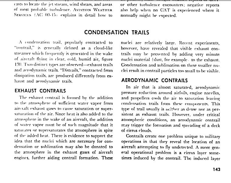 [Il grassetto è stato aggiunto dall'autore del presente articolo. Nell'originale inglese si legge testualmente: “The exhaust contrail is formed by the addition to the atmosphere of sufficient water vapor from aircraft exaust gases to cause saturation or super-saturation of the air. Since heat is also added to the atmosphere in the wake on an aircraft, the addition of water vapor must be of such magnitude that it saturates or supersaturates the atmosphere in spite of the added heat.”]