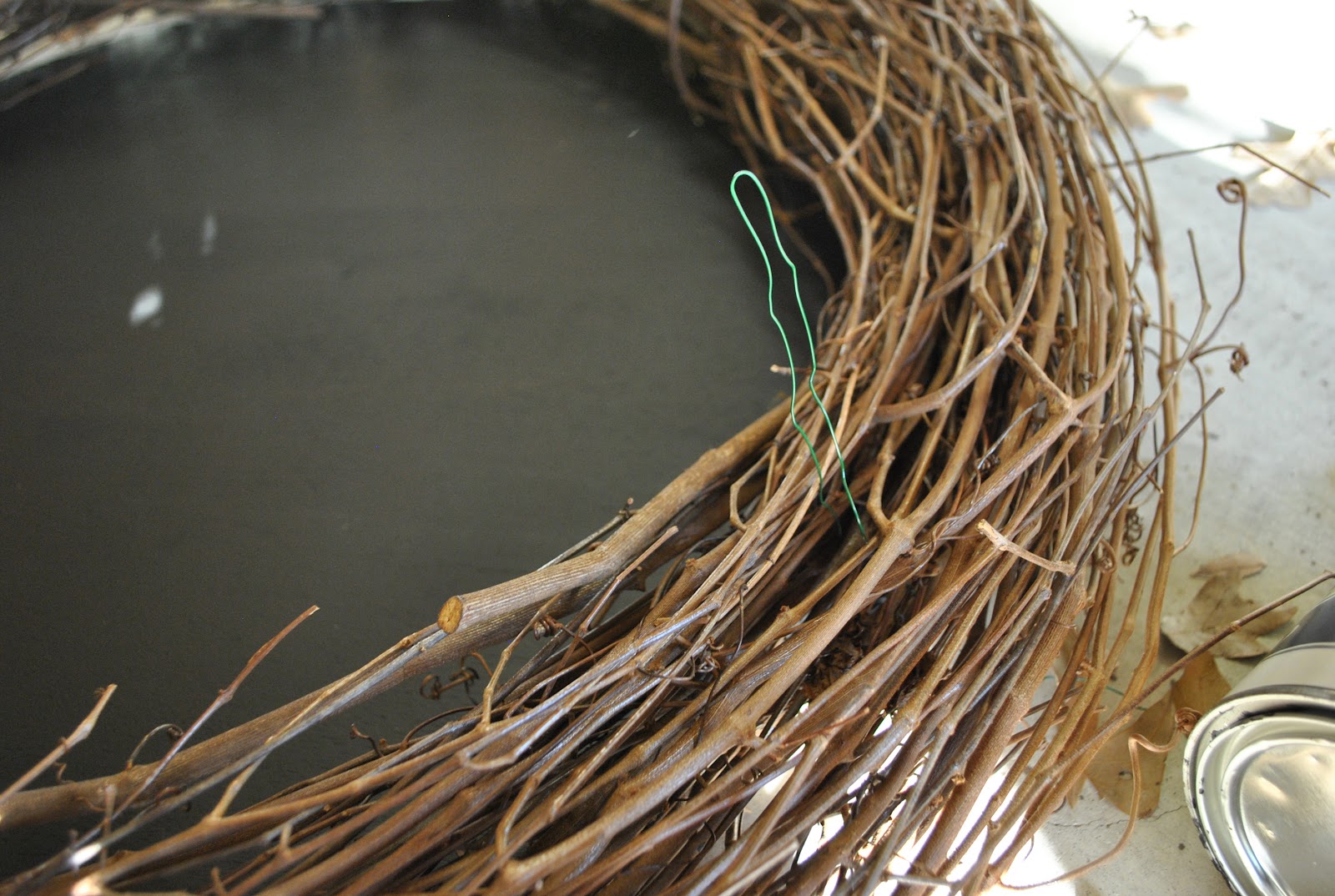 Now that both of your wire ends are at the back of your board (one through the hole), pull them tightly together and twist them like you would a bread bag twisty. Cut your wires and tuck the ends back up into the wreath so that they don't scratch the wall when you hang it.
