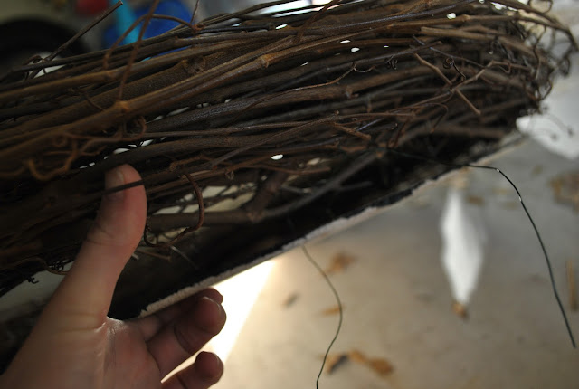 Cut a foot long piece of wire. From the front of the wreath, push both ends through the twigs. Have one end go through the your pre-drilled hole and have the other end go through the twigs just on the outside of your plywood circle. Repeat for each hole at each corner.