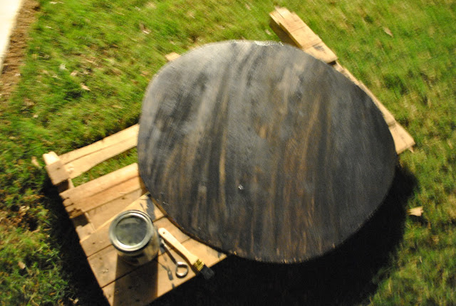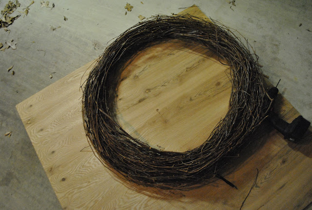 I measured out the size of my wreath. The picture is kind of deceiving, but this is a very large wreath. About 50 inches in diameter. I traced a circle on the plywood to where I thought was the middle of the bundle of twigs, so that the plywood would extend under the wreath but not come out from the side. Does that make sense?