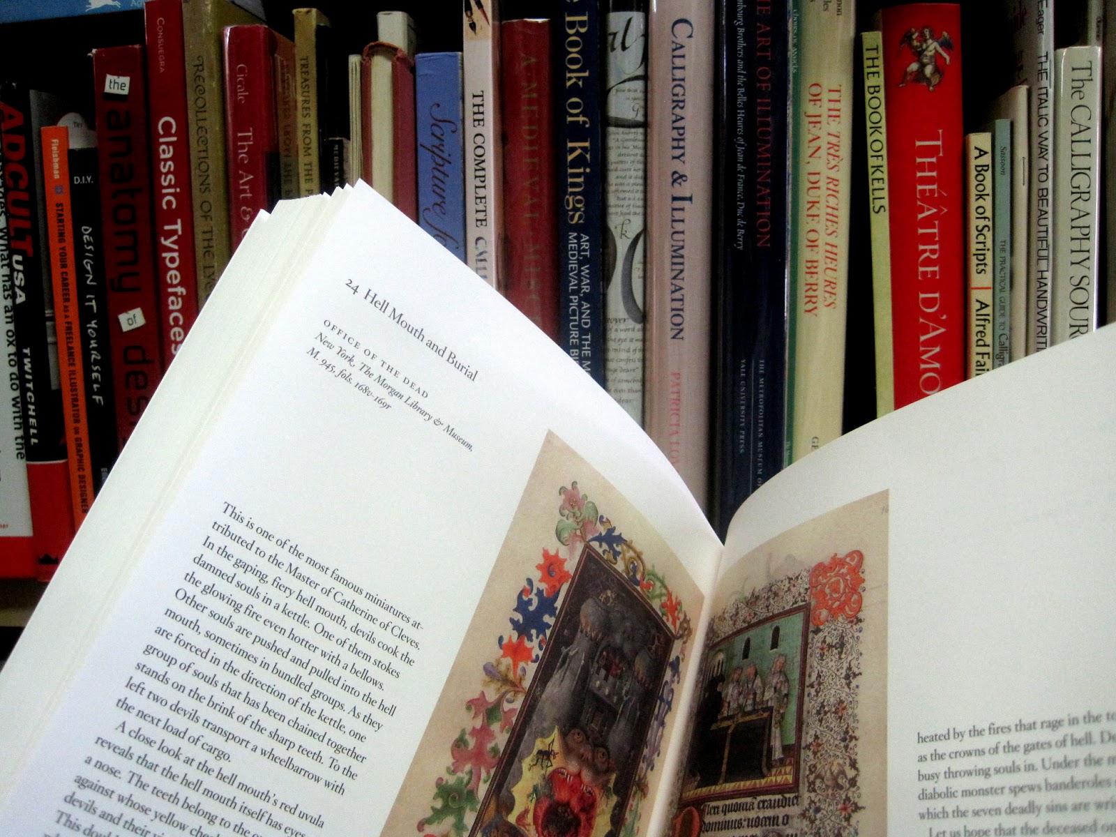 Books on calligraphy and their companion volumes on illuminated manuscripts (a personal passion) wait in an array of sizes below the illustration section (another personal favorite). There is something about the dedicated combination and labyrinthine arrangement of image, text, and borders on those pages that draws me in. Someday a person as obsessed as I am with illuminated manuscripts will stumble across this shelf, and it will make a delight of their afternoon.