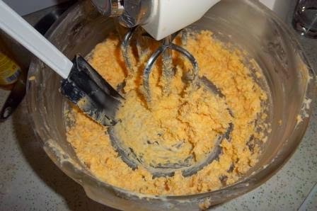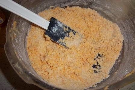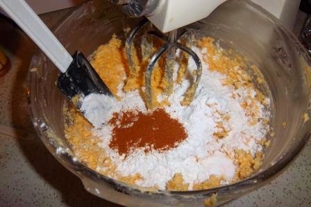 Add flour, baking powder, salt and cayenne pepper and bring it all together as a dough.