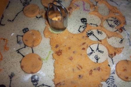 With a rolling pin, roll dough out to about a 1/2" thickness and use a small biscuit cutter to cut small discs.