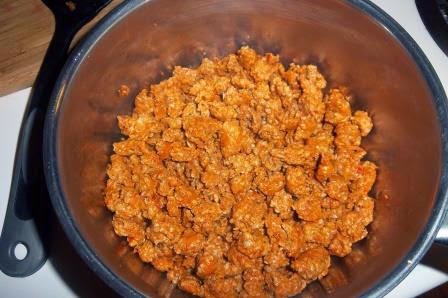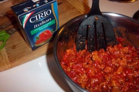 Once the turkey sausage is browned, add in 3-1/2 cups of the crushed tomatoes (set aside other 1/2 cup for final layer). Season with salt and pepper to your liking. Reduce heat to low.