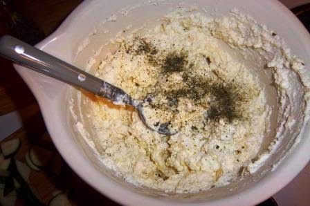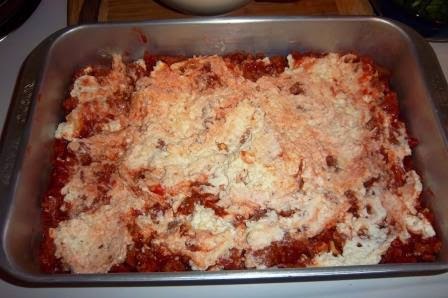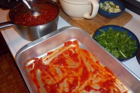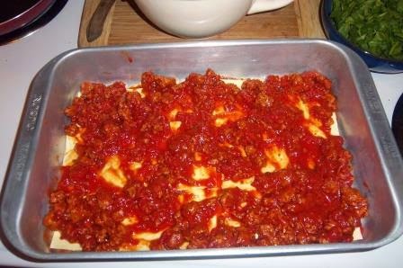 In a 9 x 13 pan, spread 1/4 cup of the crushed tomatoes you had set aside. Lay down a layer of noodles.