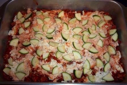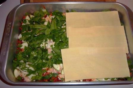 Cover with half of the spicy sausage tomato mix. Next add half of the cheese mixture. Next sprinkle half the zucchini pieces and half of the chopped spinach.