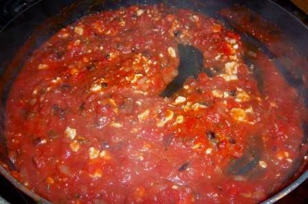 Meanwhile, add feta cheese, fresh chopped dill and fresh chopped oregano to the sauce and mix well.