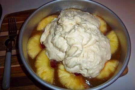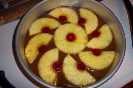square or round, your choice). Next place the pineapple slices in the bottom of the pan. Add the maraschino cherries. Set aside.