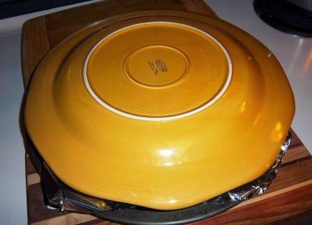Remove cake from oven. Run a knife along the inside edges of the pan. Take your serving plate and put it upside down over the pan.