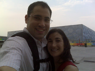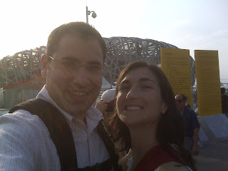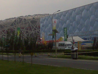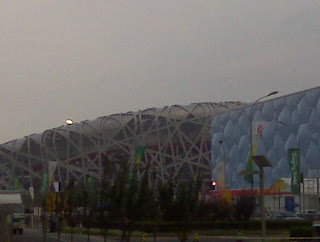 Our first pics from Beijing.... If you look closely, you can see the Olympic torch in the Birdsnest.