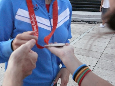 After, we headed over to the huge fountain near the water cube. We didn't know it, but that's where the Today Show was to end the broadcast for the week. Rebecca and I were playing in the fountain with the American flag when they came over and during the final minute of the show Meredith Vieira held part of the flag and hugged and kissed me! It was hilarious! All spontaneous! Then we ran through the fountain holding the flag above our heads. It was a lot of fun. From what I've found online our "AaroN ReBecca China" sign (made with "N B C") made it into the broadcast several times as well. Here is a clip of the big moment and some other fun pics: