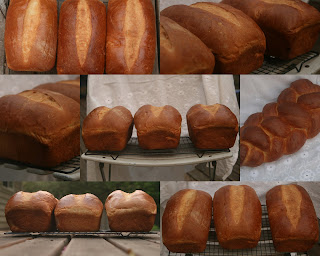 Multigrain Bread Extraordinare, I also launched three batches of white bread. Wanting to ensure lofty loaves, I multiplied Peter's measures by 1.5 (except the egg) and I was well pleased in the resulting loaves. Having only 4 bread pans on hand, I braided a loaf from both variation 2 and 3. I sliced up a bunch of pieces so no one could distinguish the breads and then taste tested them on the family.