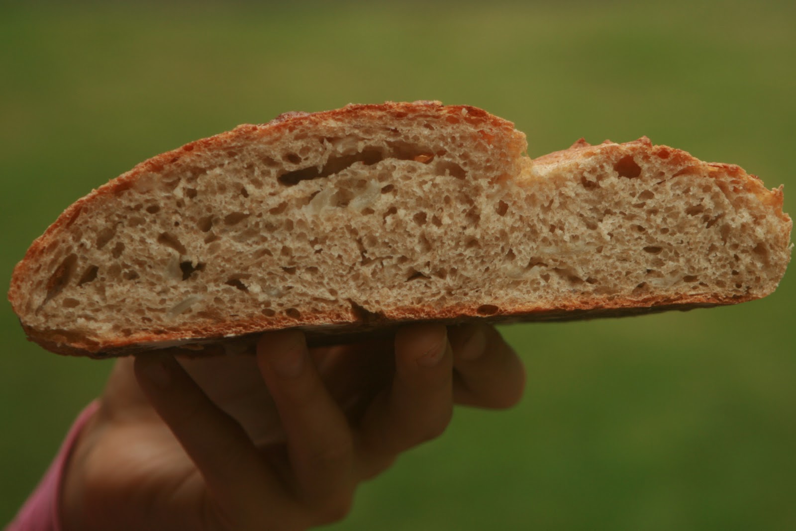 I was especially pleased with both the crumb and crust. I intentionally went a little heavy on the water to ensure I'd get larger pockets of air. The dough was a little tricky to deal with since it was very tacky and sticky but the effort paid off with the large pockets that you can see above. The crust also looked beautiful, nicely golden with delicious texture, a result of the egg-white wash applied right before going into the oven.