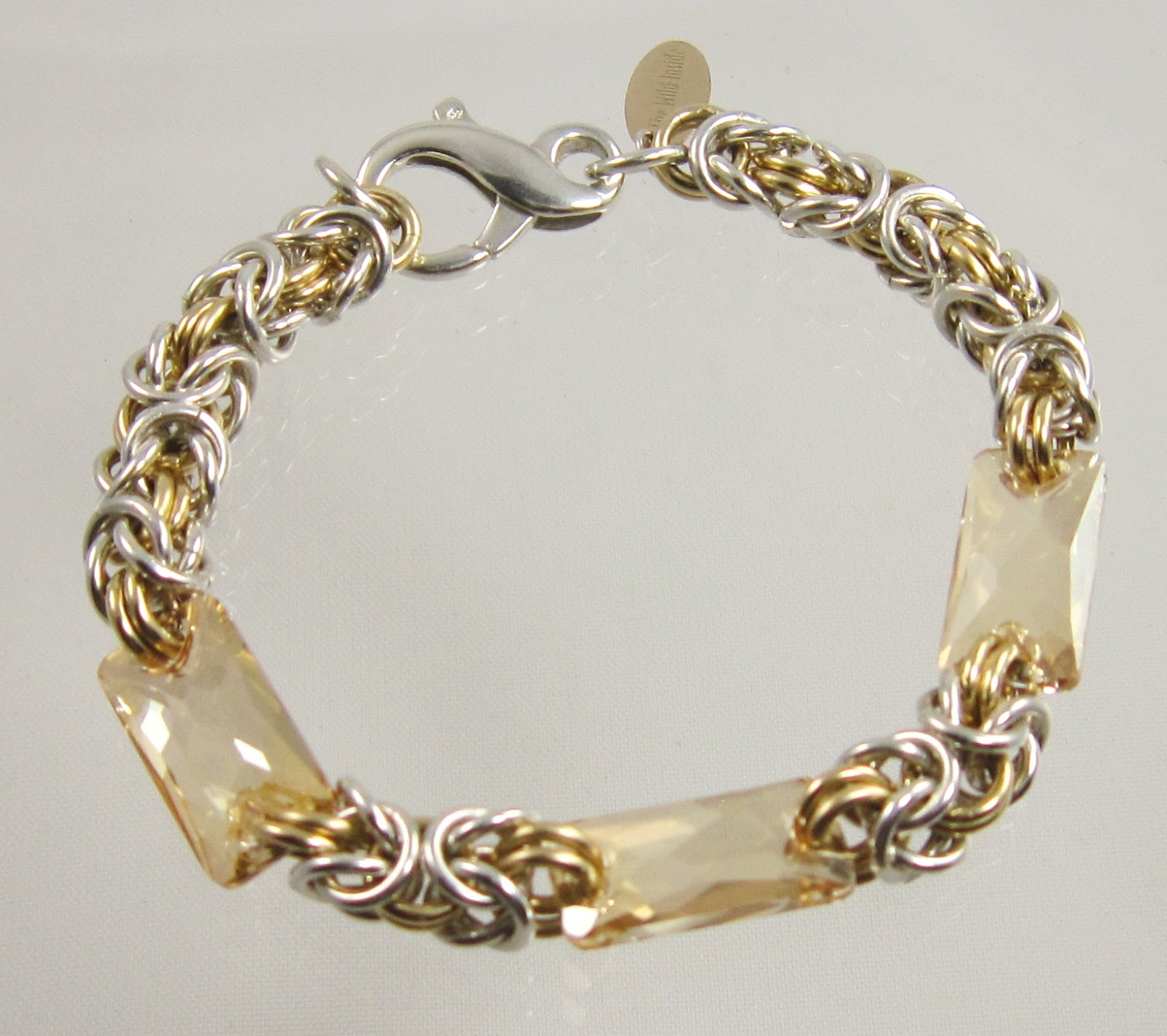 I got crazy and cut a bunch of rings a couple weeks ago with the express purpose of making a few more Byzantine bracelets. However, I wasn't in the mood for the same 'ole thing and created a couple new versions of this popular chain .. with a twist. The bracelet in my previous post included a fabulous clasp I made from fine silver clay. This version uses a combination of sterling and 14k gold-filled rings to complete the chain. And to punch up the sparkle power I added a relatively new cut of Swarovski crystal to this bracelet. I was pleased with the result! I liked this one so much, I made two, slightly different, versions. The one below places the gold-filled rings in the two-by-two position .. the other version has the gold-filled rings in the alternative position (where the sterling rings are in this photo). Though the two bracelets look about the same side-by-side, the second version uses more gold-filled rings and is, therefore, a bit more costly.