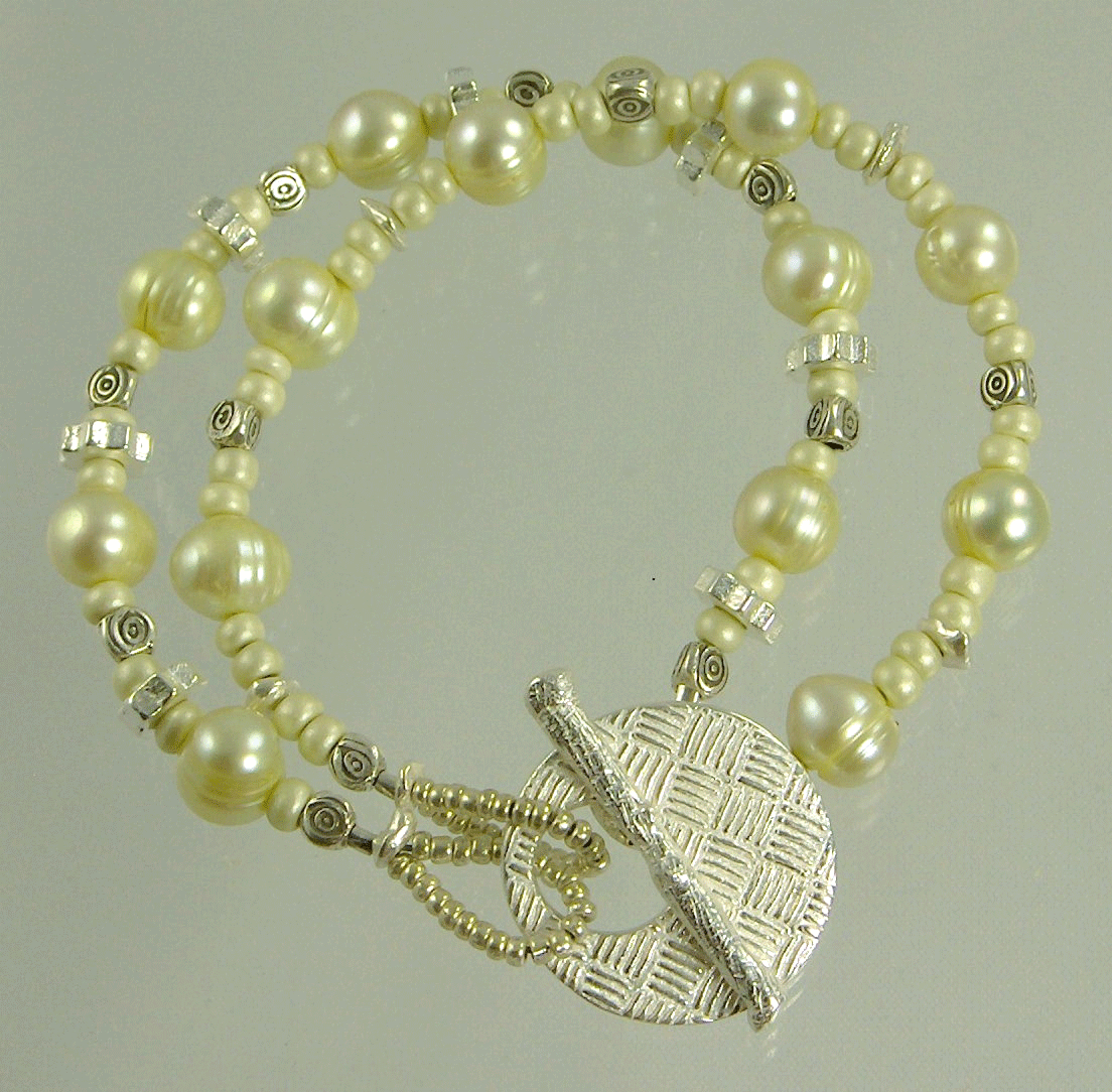 I spent an entire day working out the design, color scheme and additional beads to be used before I finally began to assemble it. It was seasonably warm and sunny last week when I put it all together .. mid 40's, which is seasonable for this time of year in northern New York! I had initially chosen some peacock blue pearls .. they looked fabulous with the silver accents, but it was so dark. So I went rummaging through my pearl drawers and found these pretty, bright, and very Spring-like Celadon-colored fresh water pearls. And as it happened, I had some similarly colored 6/0 Czech glass beads to fill in the strands. I originally tried to use them to make the bead loops attaching the ring portion of the clasp to the strand, but they turned out to be just a tad too big. It was difficult to get the bar part of the toggle to fit through the hole when the 6/0 beads were taking up so much space inside. Fortunately, I found some smaller seed beads that fit the bill .. both in size and color. The rest of the strand is comprised of little three-sided Thai silver beads, some tiny little fine silver nuggets I made, and some very cool "gear" shaped beads made of silver-coated ceramic.