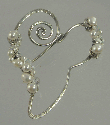 I might have ultimately come up with the pearl idea on my own, but it was a potential customer who saw at a small show in Watertown a similar pin I made for a friend of mine (who was wearing it at the time). It was the same size as this pin (I have made a smaller, more delicate version, but neglected to photograph it before someone purchased it) but was covered in three different stones representing the birthstones for my friend, her husband and their son. I explained to her what the stones on my friend's pin represented and she asked if I could do one in jewel tones. Not a problem, I told her. But after subsequent back and forth emails with multiple scans of various stones and crystals, she asked if pearls and crystals would work. Even better, I thought. Clean, simple, romantic .. with just a little sparkle.