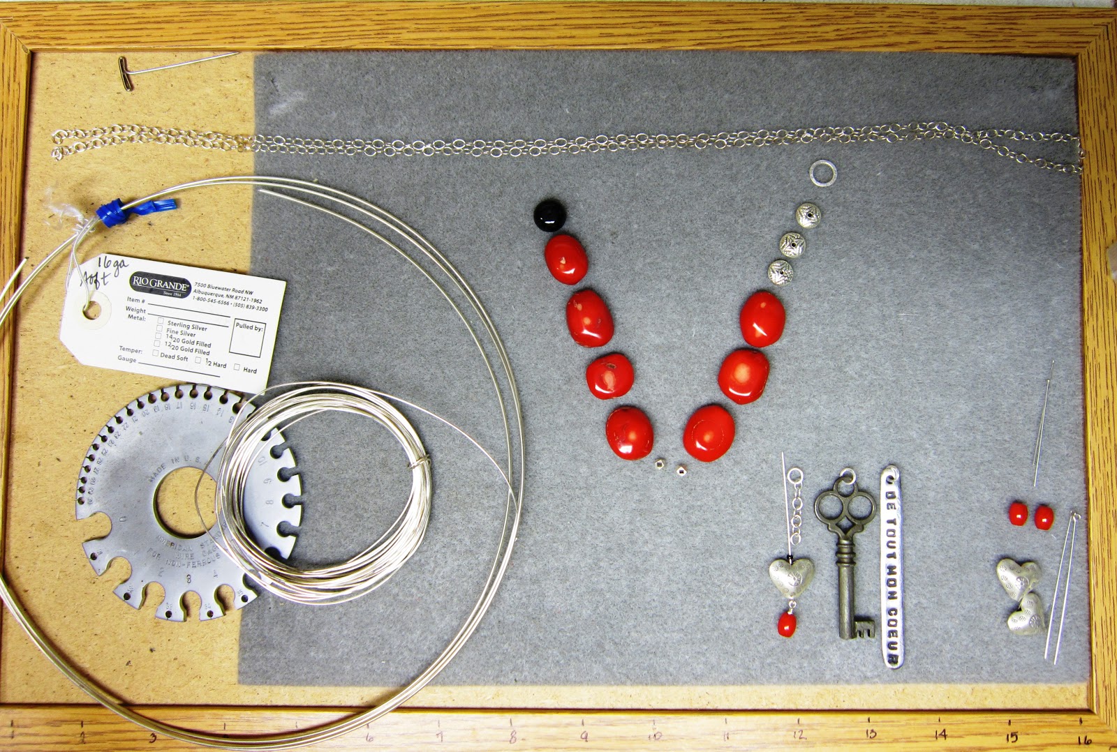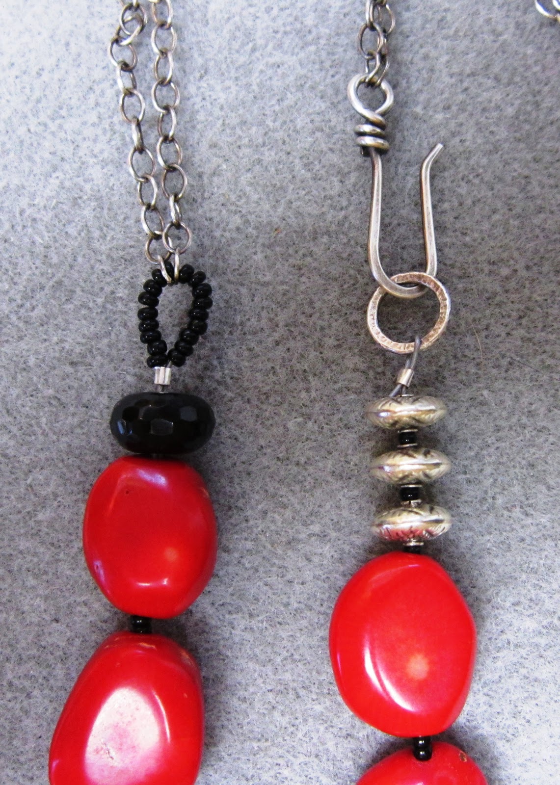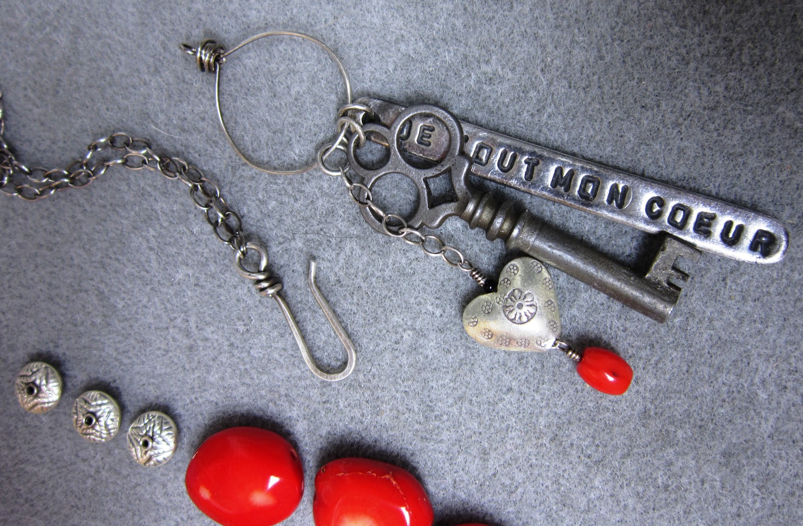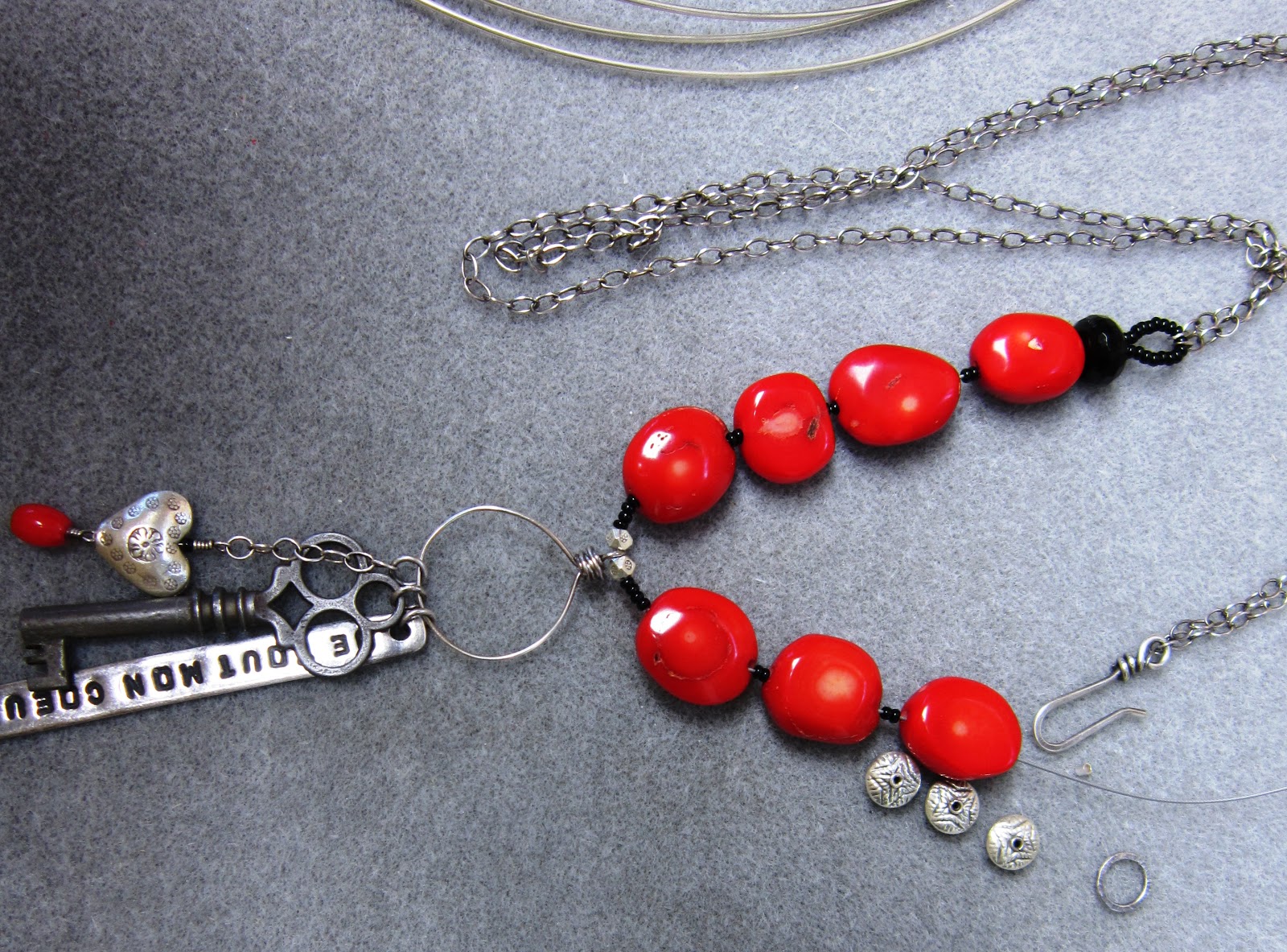 I assembled everything and put it all together on my work space so I could think about the order in which I needed to do things. I cut two 19.5" lengths of sterling silver chain for the main part of the necklace and a small 1" piece from which the little puffy heart hangs; I added - and fused - jump rings to the three components that will hang from the pendant; I wire-wrapped the little piece of coral and connected it to the eye pin that then goes through the puffy heart and will attach to the bottom of the short length of chain. I used heavier 16 gauge wire for the hook clasp, 20 gauge wire for the pendant that holds the three components shown, and lighter 22 gauge wire as a finishing touch wrap where the strung segment connects to the chain.