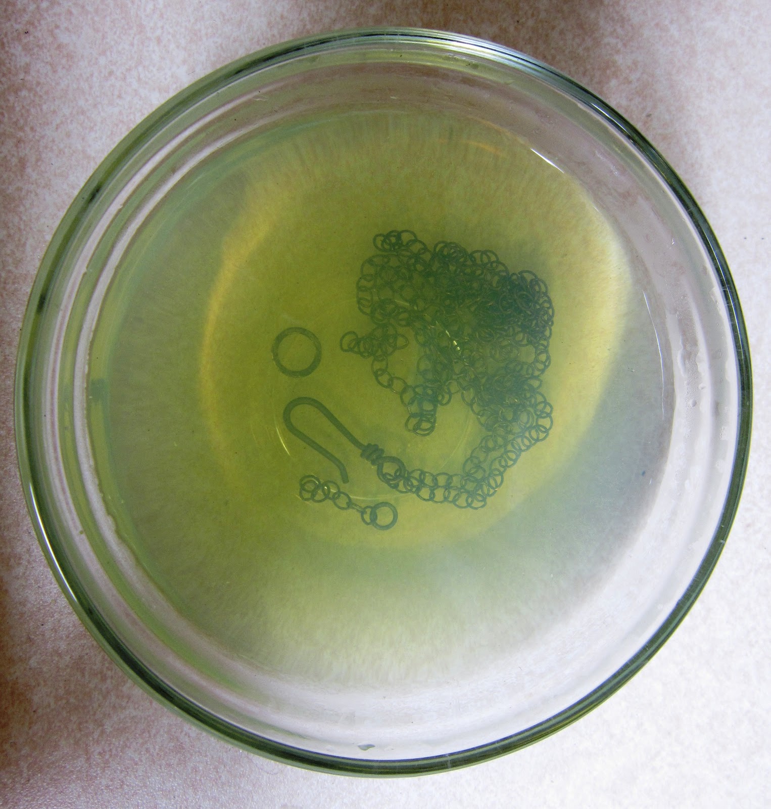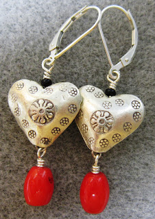 There are times when I can dip an entire finished piece into warm liver of sulfur, but I didn't want to do that with this piece; I had more control over the components by dipping and cleaning them individually. And the little puffy Thai silver hearts had already been patinated a bit, so I didn't want to have to clean them off again.
