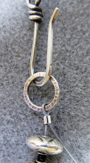 In the original piece, I used half hard silver wire for the round pendant piece that holds the three pendant elements; but I couldn't find any of my 20 gauge half hard wire. It's on my reorder list, so it's possible I used it all to make ear wires this summer. Ah well. So, what I had to do was work harden the wire a bit. I just put it on my steel block and worked it over with a small rawhide hammer. This hardens the wire without forging it. Still .. even with half hard wire, this segment of the piece can be mangled, so it should be handled with care when storing and wearing it.