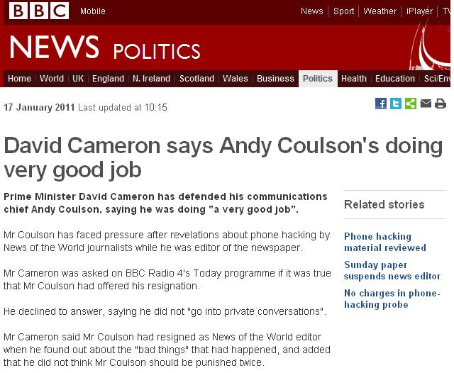 - Telling us all that his spin doctor Andy Coulson was doing " a good job" which he tried in vain to keep him in as pressure grew around his involvement in phone hacking