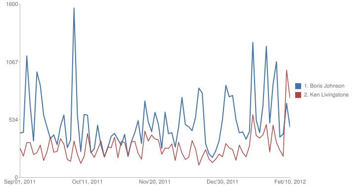 An analysis of social media conversations mentioning London mayoral candidates Boris Johnson and Ken Livingstone shows the Labour man catching up on his Tory rival, much as he has done in the