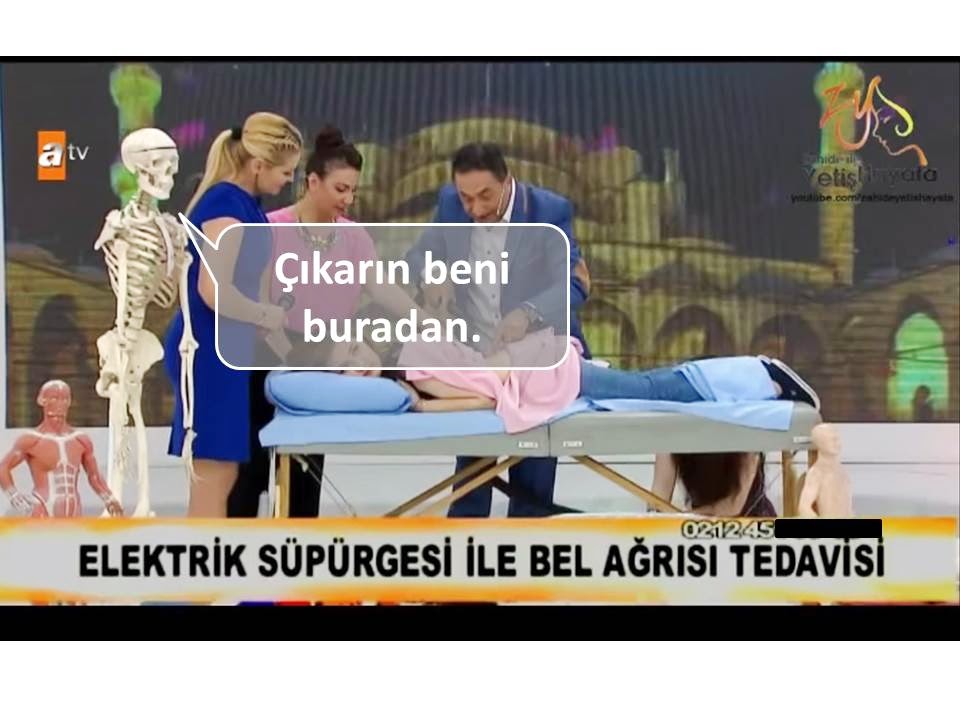 zeytinyağı sürülerek elektrik süpürgesi ile vakumlandı.''Her yüz kişinin yüzde 98'inde beli ağrımayan bir dönem olmamış. Herkesin belinde bir ağrı oluyor....Şimdi biz size genel kurallar öğreteceğiz. Bunu yaparsanız bel ağrısından çok rahat kurtulabilirsiniz. Mesela elektrik süpürgelerinizin vakum özelliğinden faydalanacağız, buraya kan getireceğiz. ... Buraya biraz sıcaklık yaptıktan sonra, oraya ozon yağı..yoksa zeytin yağı, kantaron yağı..Ondan sonra o bölgeye, elektrik süpürgenizi...''