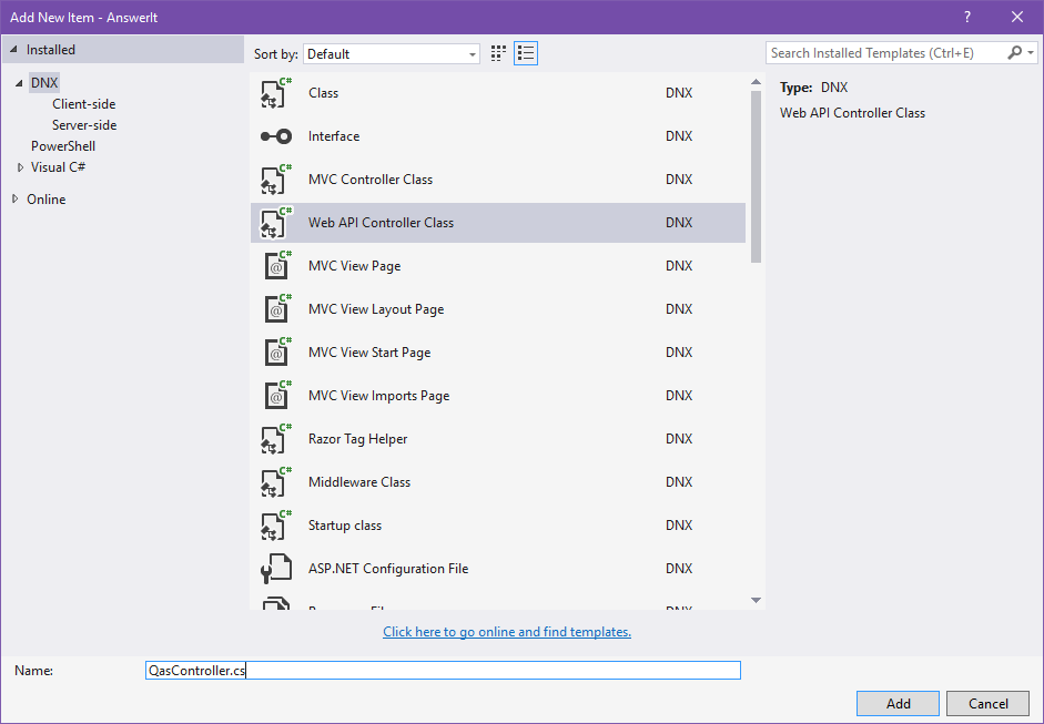 After installing, open up your Visual Studio 2015 and create a new ASP.NET Web Application. Name it “AsnwerIt” and hit ok. From the template selection window select “Web Application” under the ASP.NET 5 templates section. You might be asking yourself where is ASP.NET Core 1.0 templates? Well ASP.net Core 1.0 is formerly known as ASP.net 5. Since it is still in the RC version they didn’t change the name yet. So don’t be confused.