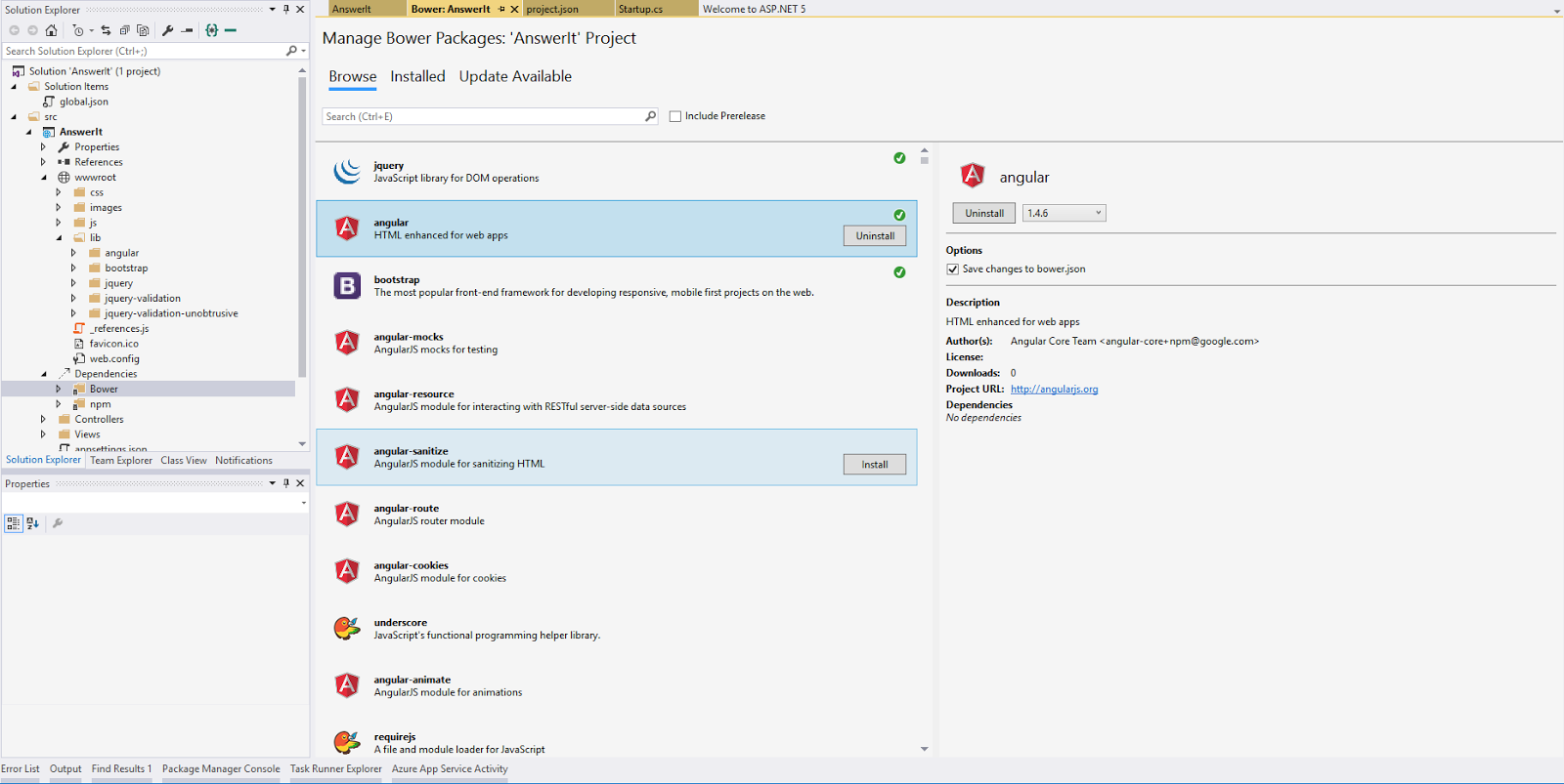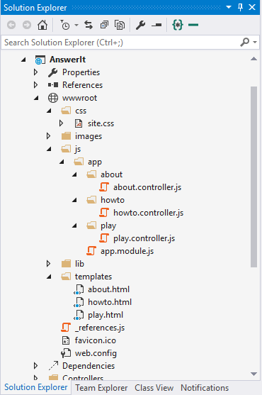 Another thing you need to do before you hit the ok is to click on the “change authentication” button on the right and change your authentication type to “No Authentication”. After the project is created you will have a “wwwroot” folder where all the client side resources go. Before copy pasting the files and folders we've created for our client side app let’s do some housekeeping. The project has bower installed by default. Bower is a package manager tool for resolve client side javascript libraries (Just like NPM, which is used to resolve node packages and Nuget, which is used to resolve .net packages). Let’s install the client packages we need. We already have bootstrap installed, we only need Angular. Expand the “Dependencies” node and right click on the Bower and select “Install Bower Packages”. From the "Browse" tab search and install Angular. After installing, angular libraries will be available in the “Lib” folder under “wwwroot”. Likewise, also install the “ui-router” package.
