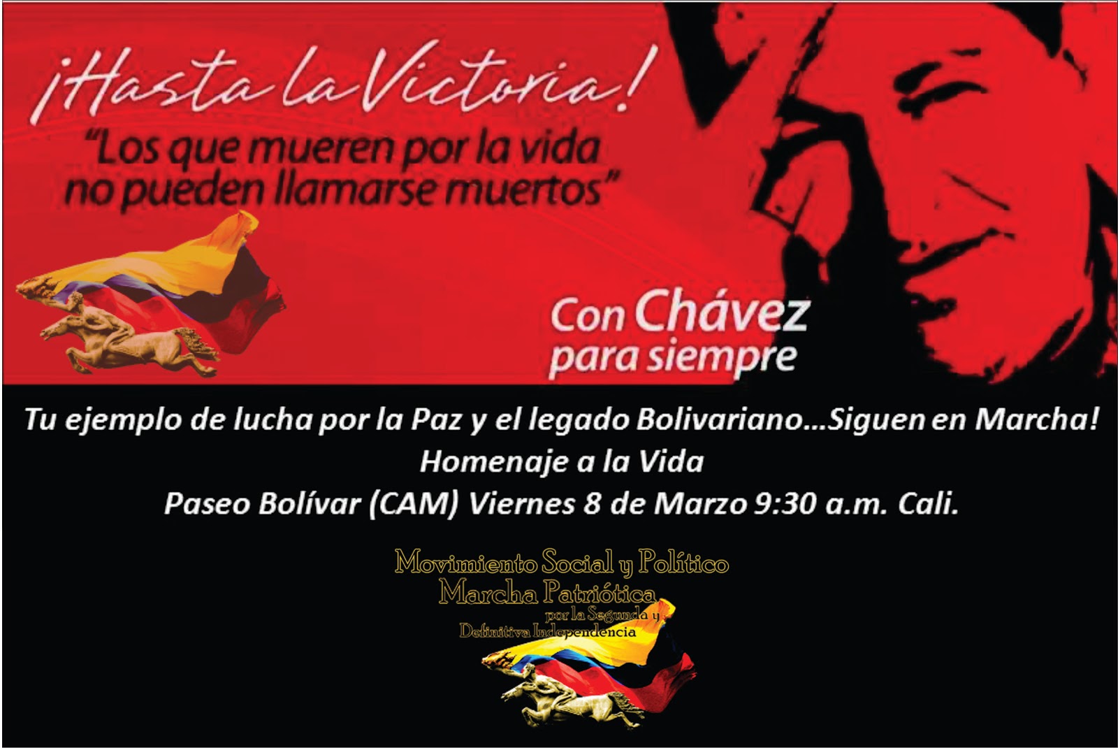 El movimiento Político y Social Marcha Patriótica capítulo Valle del Cauca, invita a rendirle un homenaje al gran líder latinoamericano Hugo Chávez, el próximo viernes 8 de marzo a partir de las 10:00 a.m , en el paseo de Bolívar (Cam), de la ciudad de Cali