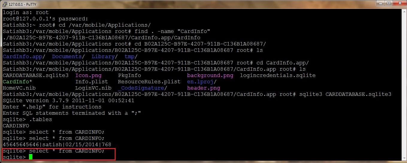 The below article explains on how to view Sqlite files and how to recover the deleted data from Sqlite files on the iPhone. For this exercise, I have created a demo application called CardInfo. CardInfo is a self signed application, so it can only be installed on a Jailbroken iPhone. The CardInfo demo application accepts any username & password, then collects the credit card details from the user and stores it in a Sqlite database. Database entries are deleted upon logout from the app.