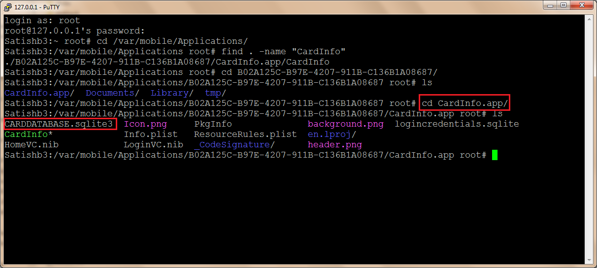 /var/mobile/Applications/ folder and identify the CardInfo application directory using
