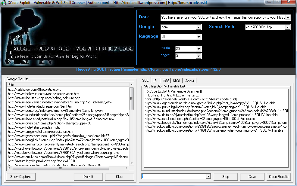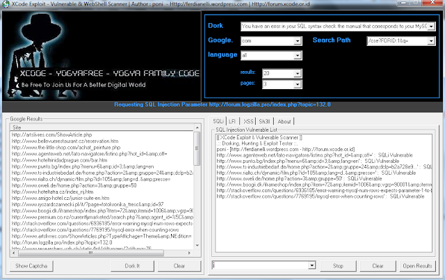 "Xcode Exploit Scanner" which would use built in dorks in order to find a SQL injection vulnerability.