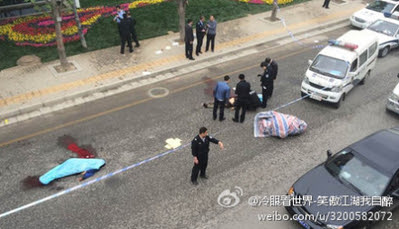 据大陆媒体报导,4月10日下午13时40分许,西安市西万路与丈八路路口发生一起伤人事件,事发地附近有一个劳务市场,人流密集,车流量较大。涉案4人中,2人当场死亡,2人受伤。事发后,两名男子躺在在机动车道上,现场血迹斑斑。受伤的是1名女子和1名男子。
